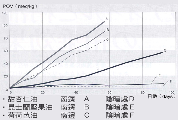 縱軸的POV為氧化程度、橫軸表示由實驗開始的日數。由實驗結果得知,將植物油置放於無日照的陰暗處保存,對於預防氧化的效果非常顯著。