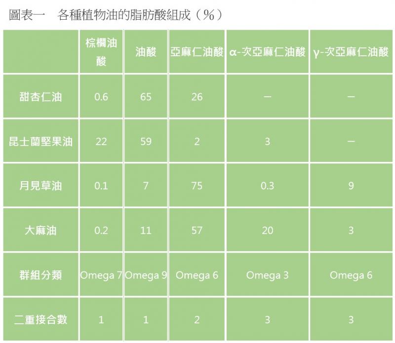 如圖表一所示,具有一個「二重接合」的棕櫚油酸〈高級不飽和脂肪酸(POA)〉及油酸(高級不飽和脂肪酸)便不易氧化;亞麻仁油酸(必須脂肪酸)、α-次亞麻仁油酸 (αlinolenic ACid﹞、γ-次亞麻仁油酸(γlinolenic ACid﹞則較易於氧化。因此可知,就植物油來說昆士蘭堅果油(Macadamia Nuts)抗氧化性質非常強,而月見草油及大麻油較易於氧化。