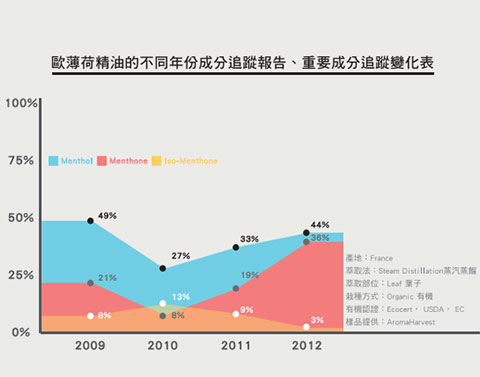 對於Menthone等酮類成分的比例需注意(酮類在代謝、神經、肌肉等安全性的考量都較需芳療師特別注意),當年度若該成分比例稍高,幼兒、孕婦、年長者、纖弱體質者的劑量就要更小心。