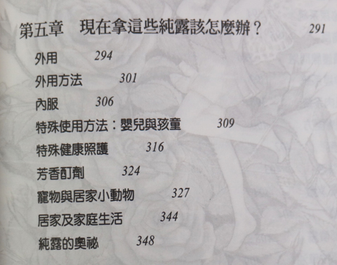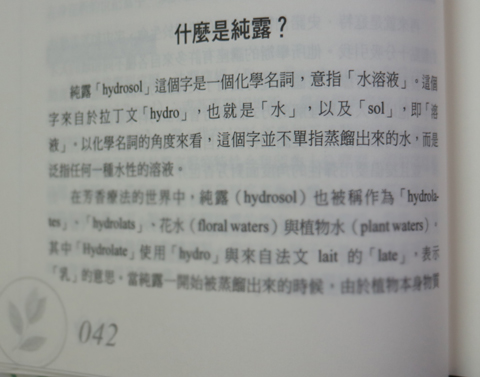 透過本書,我們可以開始辨別純露的品質,明白有些純露可能不是真的(像是大部分的柑橘類純露),甚至很火紅的玫瑰純露,有些商家其實只是人工合成所製造,這也是為什麼一些人會說:「我對玫瑰很容易過敏。」可是其實他所接觸到的都不是真正天然的玫瑰產品。