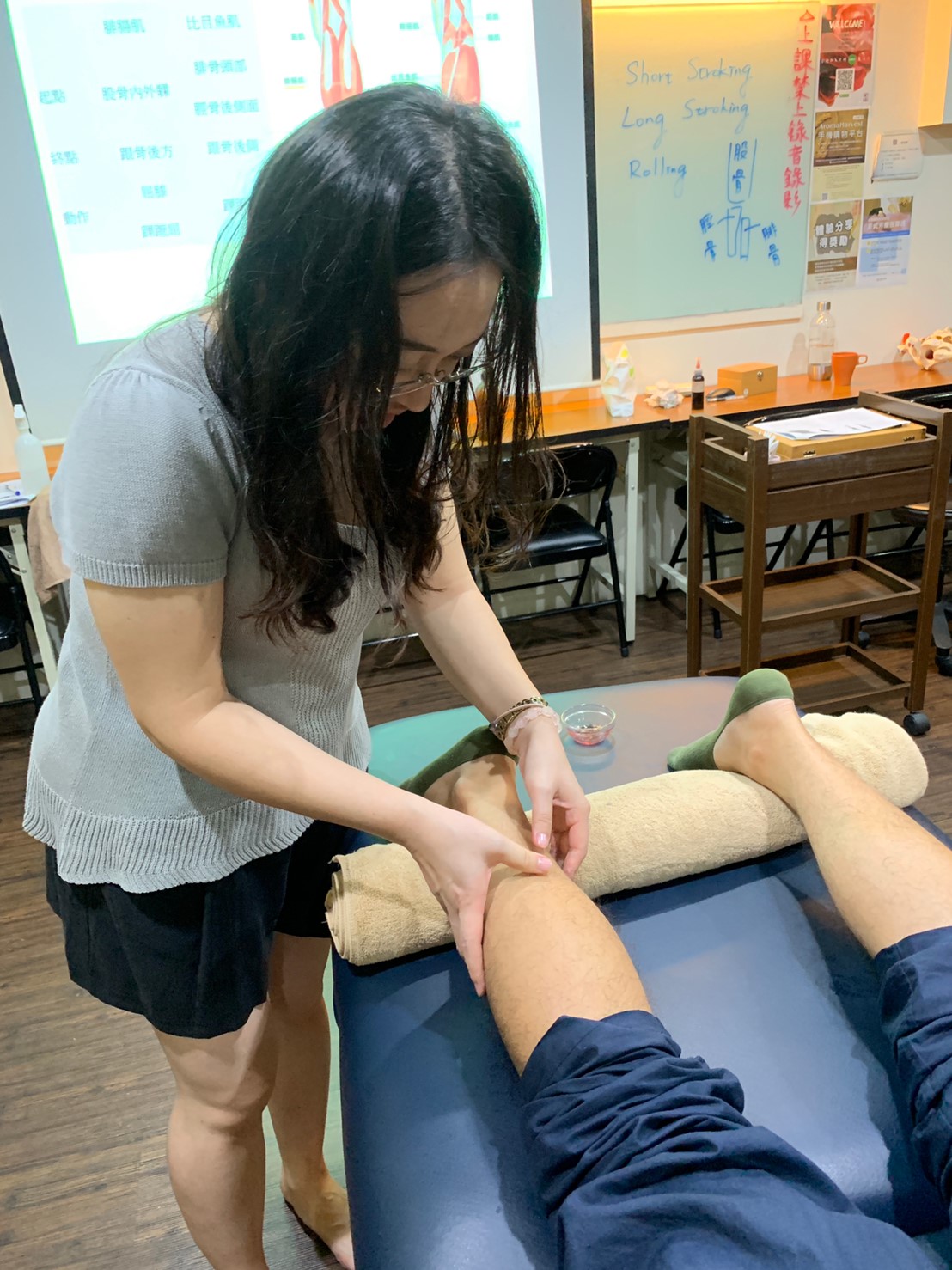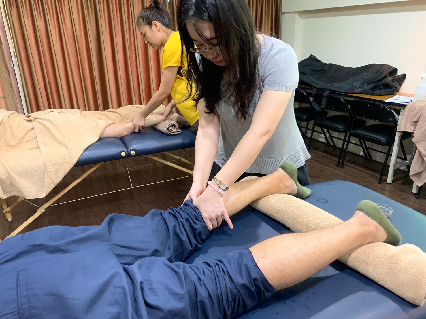 所以Bella老師提醒一定要問個案,力道可以嗎? 還有個案趴著的時候,會用毛巾把腳踝托起來,讓小腿肌肉可以處在最放鬆的狀態,就像我們找按摩一樣,一定也會挑選最舒服的環境跟手勢,Bella老師千叮萬囑這些重要的眉角可不能漏掉喔!