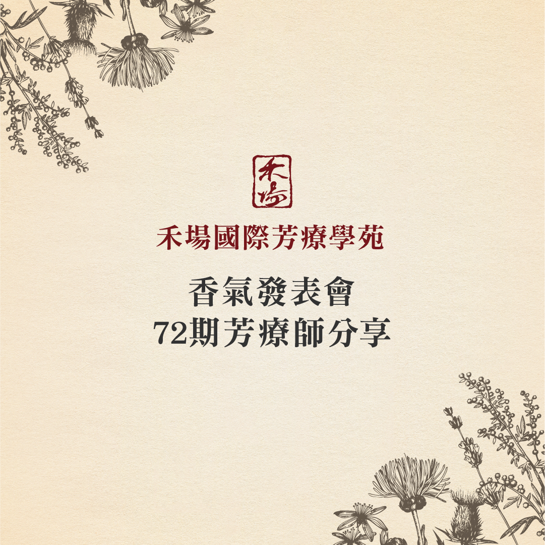 「香氣發表會的魅力:芳療師分享精油應用的奇幻之旅」 林子喬 香氣發表會就像是一個是時裝發表會的舞台,芳療師就好比是設計師,而精油就是模特兒身上的服裝,向世人展現芳療世界的奇幻與華麗! 韋維 身為芳療師我深深體會到,精油的神奇不只是在書本上,更多的驚喜是在身體上使用後,我們可以用嗅吸、薰香、和皮膚塗抹等方式,感受它給身體帶來的改變。就算是一樣的精油,每次使用後感覺都不一樣⋯所以,假如妳想真正了解精油的神奇,就從使用第一支精油開始「探險」吧⋯ 張諭坤 香氣發表會後,很多朋友或說同學開始跟我預約英式按摩體驗,又或是詢問我日常生活用油的配方,讓我覺得學芳療是件非常開心的事情。 芳療師的經驗分享與建議 陳麗玲 禾場的香氣發表會不但可聽到各式芳療的案例, 也是課堂外快速累積有效配方的場域。最特別的是, 一起重溫芳療師與個案的諮詢/追踪過程, 發現愛與關懷的可貴。