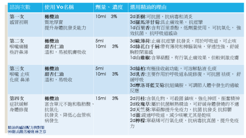 逐次諮詢個案身體狀況進程, 並搭配調整有效的精油組合,來舒緩個案因感冒引起的不舒服症狀。