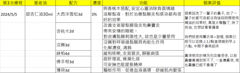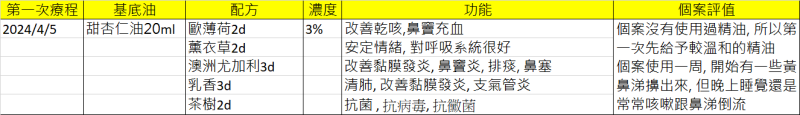 個案沒有使用過精油, 所以第一次先給予較溫和的精油