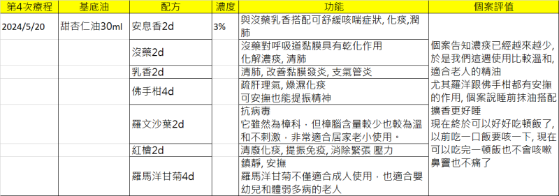 個案告知濃痰已經越來越少, 於是我們這週使用比較溫和, 適合老人的精油
