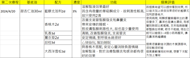 因個案希望可以趕快看到效果, 所以這次加上排痰效果很好的藍膠尤加利跟香桃木.