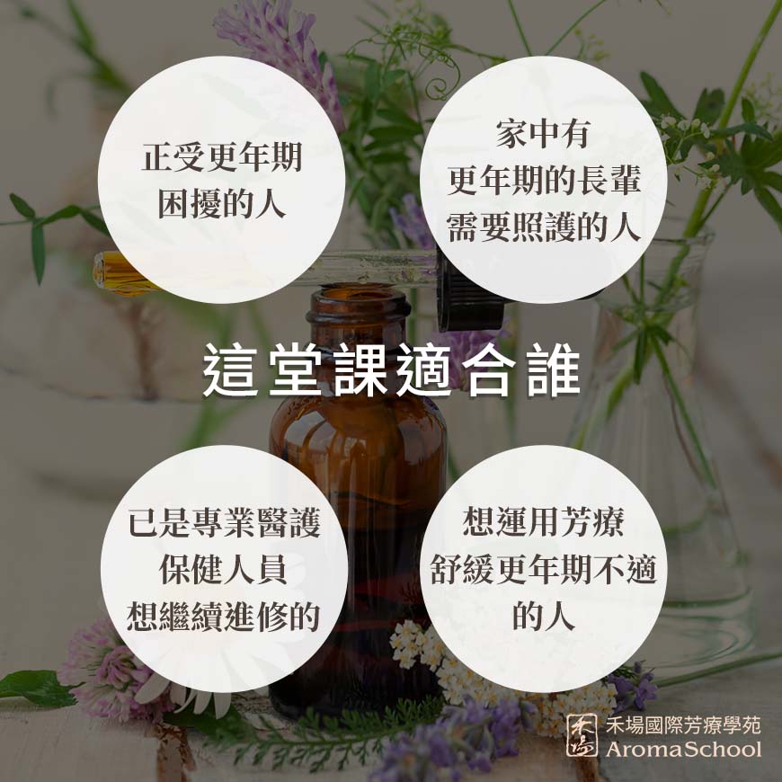 進入更年期,身體與情緒變化令人困擾,但芳療的力量可成為舒緩之道。課程涵蓋更年期症狀、芳療精油運用、及配方示範,將運用類雌激素、平衡賀爾蒙、皮膚護理等,幫助調和體內變化,並分享醫學證據證實芳療的效果。讓您走過更年期,焕發自信活力。
