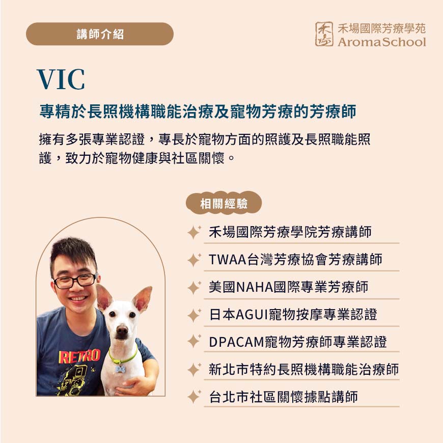 融入DIY教學、精油及純露的選用,以及毛小孩容易有的病症對應方法,不僅能輕鬆理解芳療的精髓,還能親手製作出專屬毛孩的護理品。我們將帶你探索這有趣的寵物芳療世界,為你的毛小孩帶來健康與幸福!