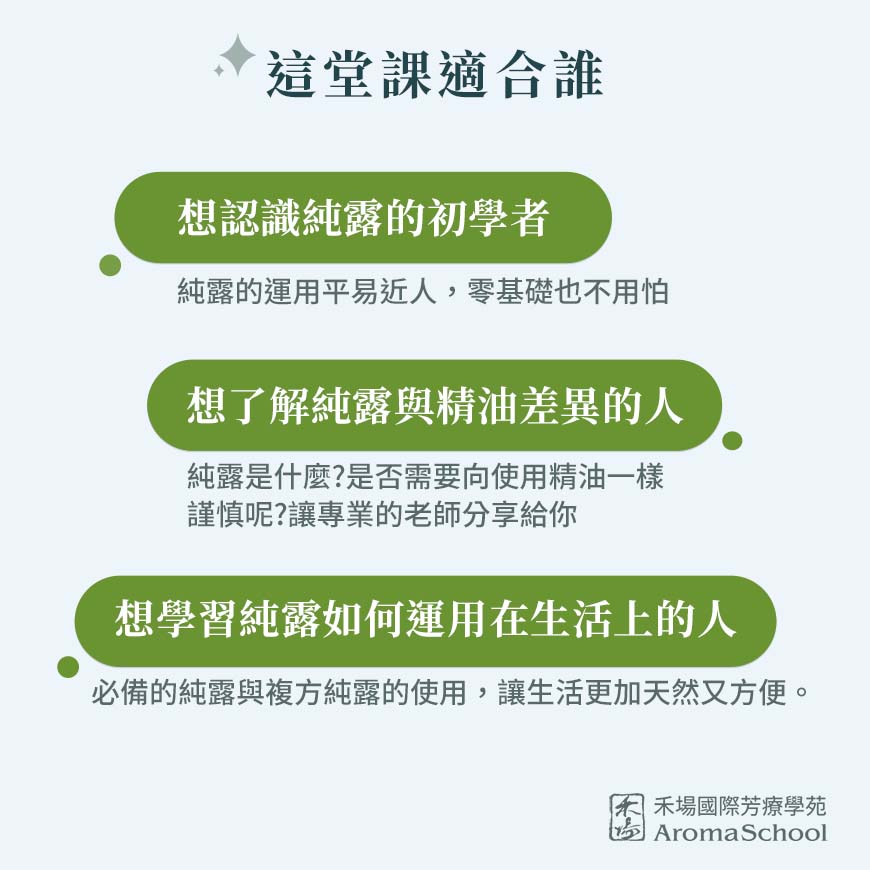 課程不僅止於理論,更將引導你親自動手製作屬於自己的複方純露。這是一次實踐與創意的融合,老師將分享不同純露進行調配及運用,讓學習的路更豐富。