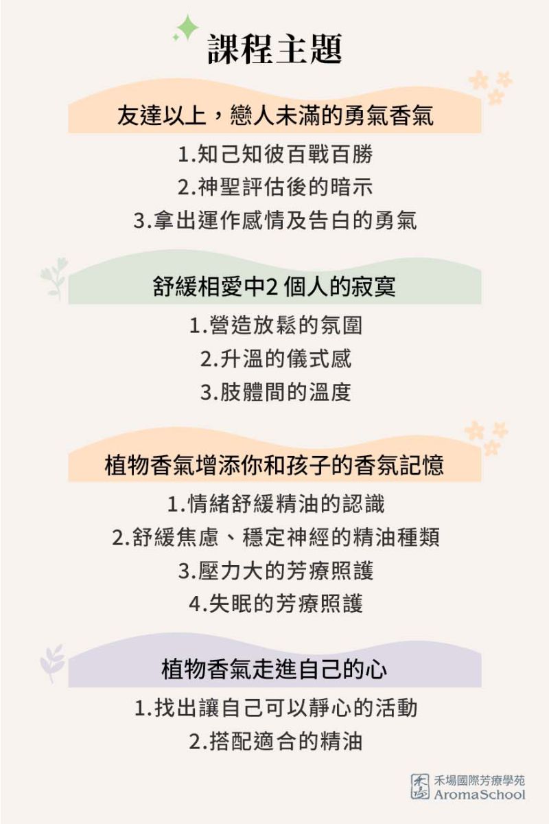 專業的Rose老師,運用植物香氣的特性,引導我們如何將香氣變成與親密關係成為最好的溝通橋樑。讓我們了解在愛別人之前,先關注自己的感受,運用香氣引導,找回內在的能量。