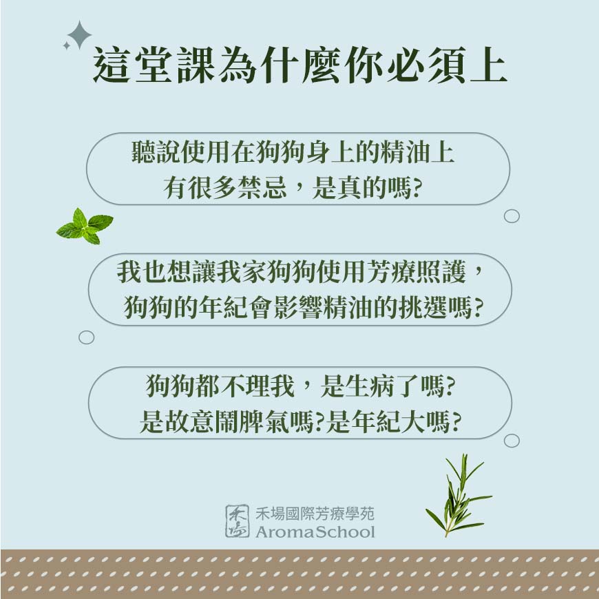 幼犬所需對應的照護與老犬所出現的毛病不同,專業寵物芳療師Vic老師將帶領你認識不同年齡層的狗狗特性,再引導使用相對應的精油,讓你不必擔心是否使用錯了精油而會傷害到狗狗。