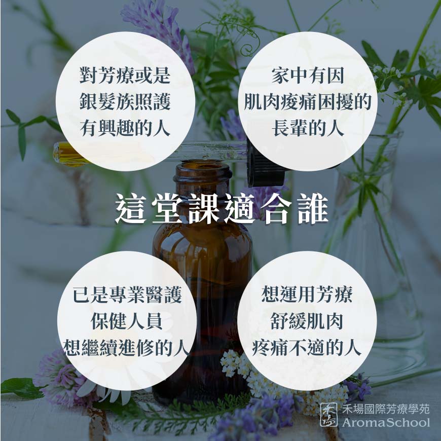 課程全面介紹以肌肉疼痛的原因開始介紹並教學精油的特性及運用。對症下精油的教學方式,讓您輕鬆掌握照護肌肉疼痛長者的技巧,讓長者透過芳療的協助,能夠有效提升生活品質,重拾往日笑容。