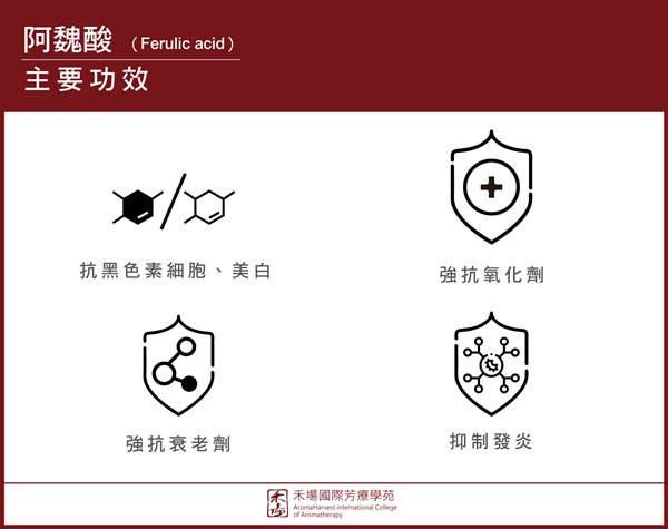 是純露中常見的化學分子,從阿魏(Ferula)植物中發現的天然物質,化學式是「4-羥基3-甲氧基肉桂酸」,分子小使得容易進入皮膚發揮效用,在眾多大品牌的護膚品中都可以看到添加阿魏酸這個成分。